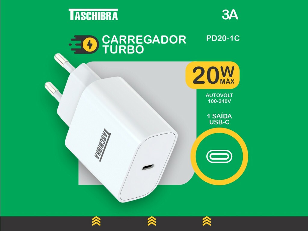 CARREGADOR TURBO 20W USB-C TASCHIBRA R$ 39,15 à vista ou em até 1x de R$ 43,50 no cartão Comprar Lançamento CARREGADOR TURBO 20W USB-C TASCHIBRA CARREGADOR TURBO USB TASCHIBRA PARA ELETRONICOS PD Referência: 15736 Modelo/Marca: Taschibra Fabricante: Marca: Taschibra Entrada: USB C Entrega imediata CABO USB-C/USB-C POR R$17,50: R$ 39,15 à vista ou em até 1x de R$ 43,50 no cartão R$ 39,15 à vista com 10% de desconto Boleto Bancário R$ 39,15 à vista com 10% de desconto Parcelas 1x de R$ 43,50sem juros Quantidade Comprar Tire Suas Dúvidas Pelo Whatsapp Esse produto encontra-se indisponível. Deixe seu contato que avisaremos quando chegar. Seu nome: Seu e-mail: Desejo receber e-mails com lançamentos e promoções. Avise-me quando disponível Cep Calcular Frete * Uso: Interno* Voltagem (V): AUTOVOLT (100-240V)* Frequência (Hz): 50/60* Potência Máxima (W): 20* Tipo Dimerização:* Garantia: 1 ano* Produzido em: Plástico, placa de circuito impresso e componentes eletrônicos* Fonte de Alimentação: Elétrica* Comprimento Produto (mm): 42* Largura Produto (mm): 27* Altura Produto (mm): 80* Características: USB-C: 5V 3A - 9V 2,22A - 12V 1,67A