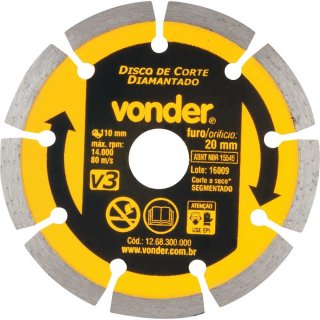 1 Serra mármore. Acompanha: 1 chave allen, 1 chave de boca e 1 disco diamantado V3 VONDER. Indicada para uso na construção civil para cortar mármore, granito, concreto, alvenaria, telha, tijolo, ardósia, pedras em geral, madeira, entre outros, utilizando